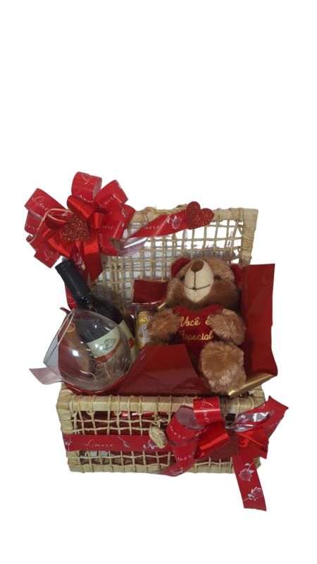 Cesta baú decorada nº 02: Urso para 1 caixa de Ferrero com 8 bombons, 1 vinho (conforme disponibilidade) e 1 taça para vinho de vidro.