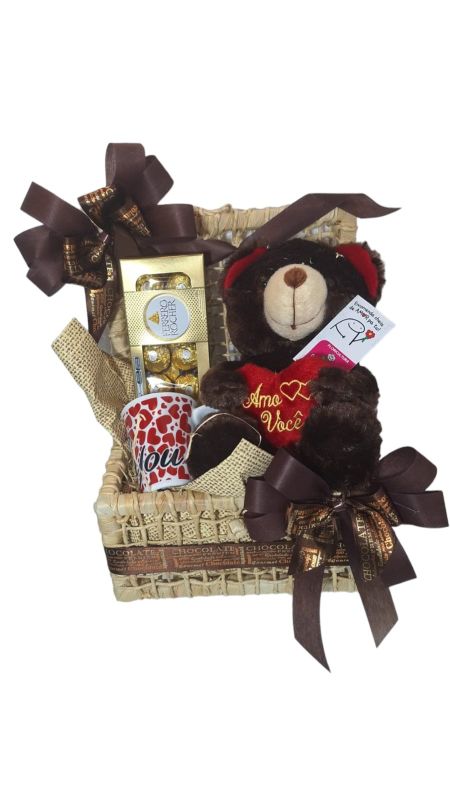 Cesta baú decorada nº 02: Urso para 1 caixa de Ferrero com 8 bombons e 1 caneca de cerâmica amor.
