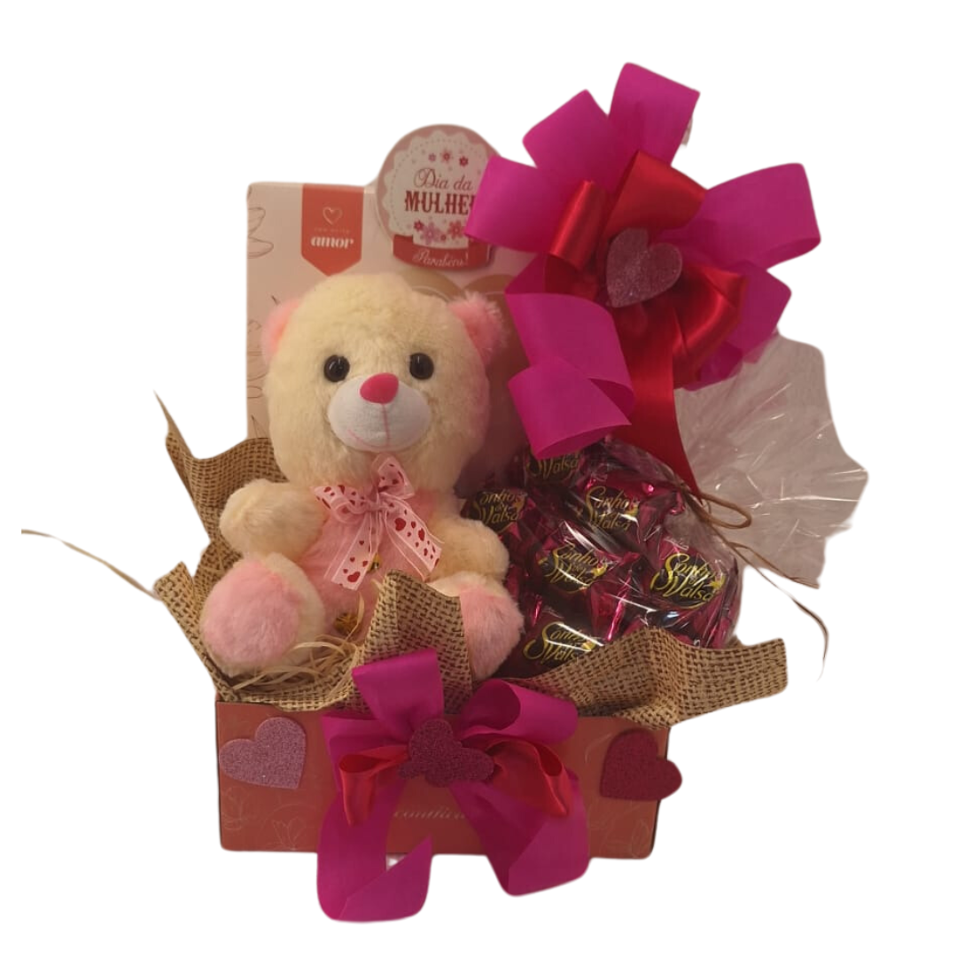 Linda caixa decorada com urso pequeno acompanhado por bombons Sonho de Valsa.