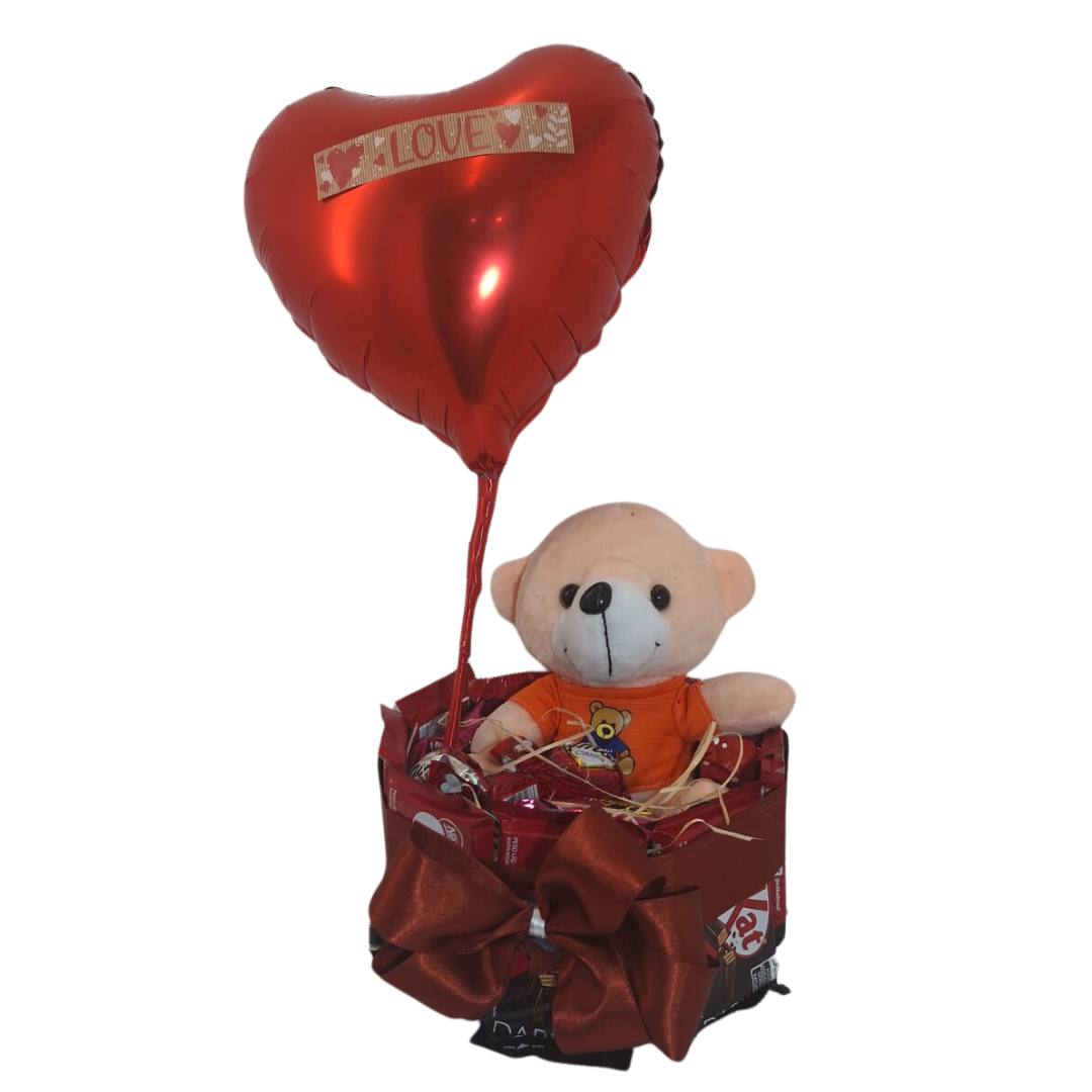 Mimo Kit Kat com 7 barrinhas, 1 urso pequeno, 1 bexiga em formato de coração e 10 bombons diversos.