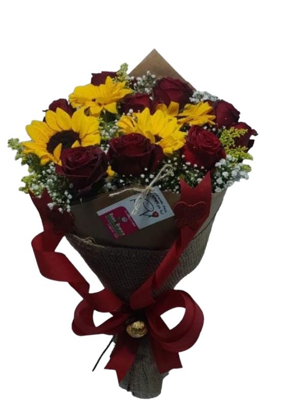 Buquê com 4 girassóis e 9 rosas vemelhas.