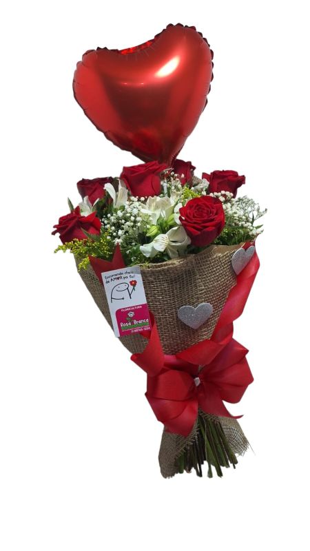 Buquê com 6 rosas no rústico, mais uma bexiga de coração.