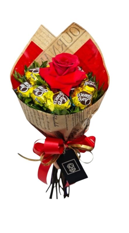 Encante quem você ama com o "Mini Buquê Amor de Ouro", uma combinação perfeita de beleza e sabor. Este adorável buquê apresenta uma única rosa vermelha vibrante, símbolo clássico do amor e paixão, cuidadosamente selecionada para garantir frescor e beleza.