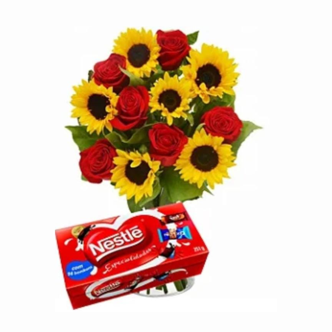 Buquê Radiante: 6 Rosas e Girassóis com Chocolate Nestlé Especialidades - Alegria e Sabor em um Só Presente!