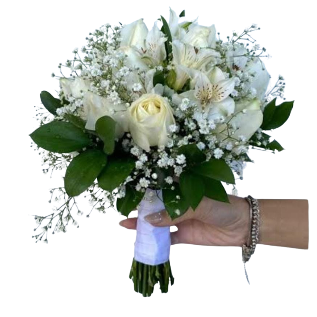 Promoção buquê de noiva com rosas claras, mosquitinho e astromelia.