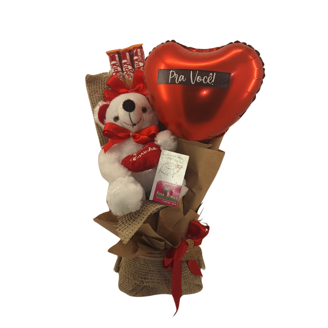 Box de presente em uma combinação perfeita com 1 urso de pelúcia pequeno, com uma beixiga vermelha e 3 barrinhas de chocolate Kitkat conforme foto. Envolvido em um lindo arranjo rústico, deixando original e muito delicado.