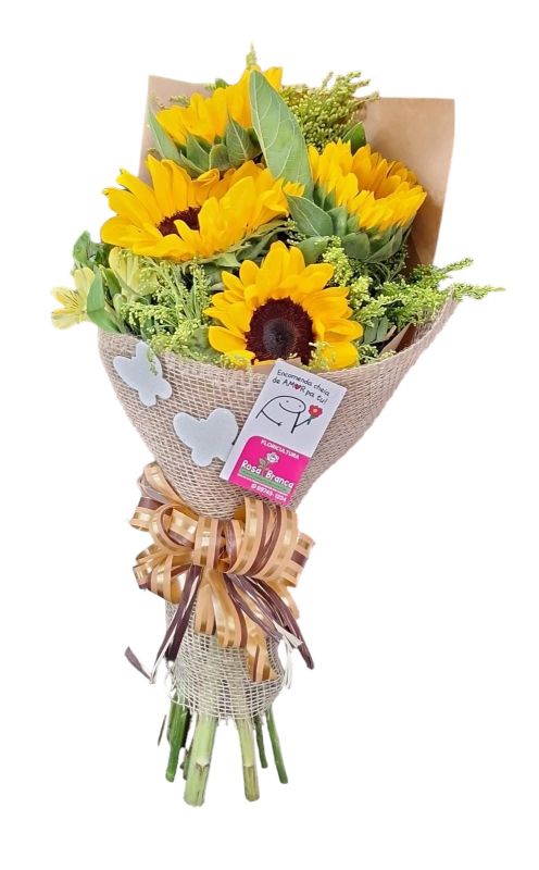 Buquê com 4 girassóis na embalagem rústica.