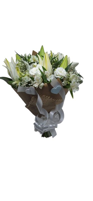 Buquê com 12 rosas brancas mescladas com lírios brancos e mosquitinho.